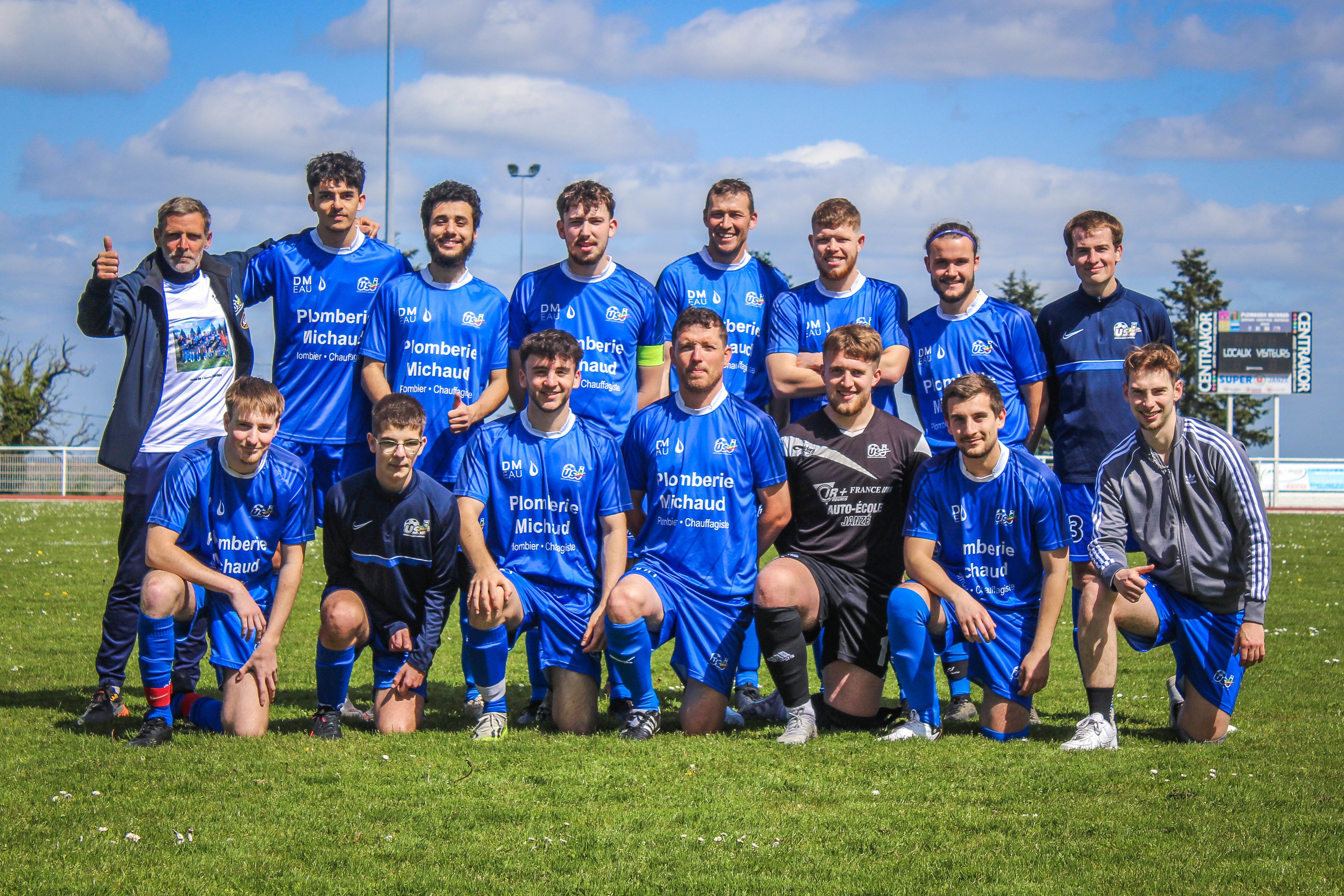 À genoux de gauche à droite : Enzo Frein, Yann Galhaut, Thomas Potin, Sylvain Gauthier, Alexis Aubin, Louis-Antoine Ray, Gwendal Dumast.Ton film préféré ou séries ? Ta playlist ?Quand j’étais môme les Terminator et les Rocky m’ont marqué mais plus récemment Les Avengers (Marvel). Mes séries : « Stargate, la Porte des Étoiles », et ma série du moment c’est « Yellow Stone » avec Kevin Costner et la charmante Kelly Reilly. Mes séries d’enfance étaient « L’homme qui valait 3 milliards » et « L’homme qui tombe à pic » avec Lee Major.En musique j’étais plutôt Punk Rock avec Metallica, AC/DC, Nirvana, les Négresses Vertes, Manu Chao... Maintenant j’écoute Soen, Linkin Park, Maneskin, Ayron Jones… J’écoute la musique par rapport à l’état d’esprit du moment, voire mes émotions du moment . En ce moment c’est du Rock.Ton plat préféré ?Les Galettes-Saucisses de Jean-Jean. La nourriture pour moi est une seconde passion après le sport.Ta destination rêvée ?Le JaponLe coach le plus classe de France, avec son meilleur joueur, Mathéo Lacire.Un dernier petit mot pour nos bénévoles et supporters ? Merci à toi pour toutes ces années passées au club !Je remercie tous les bénévoles, le bureau, les joueurs, les dirigeants. Suite à ma mutation professionnelle (dans le Morbihan), je suis forcément moins présent et moins disponible, mais je continue à suivre la vie du club. Venez encourager nos petits bleus le vendredi soir, le samedi et le dimanche ! Allez l’USJ ! Et n’hésitez pas le dimanche à venir commander vos crêpes auprès d’Hélène.