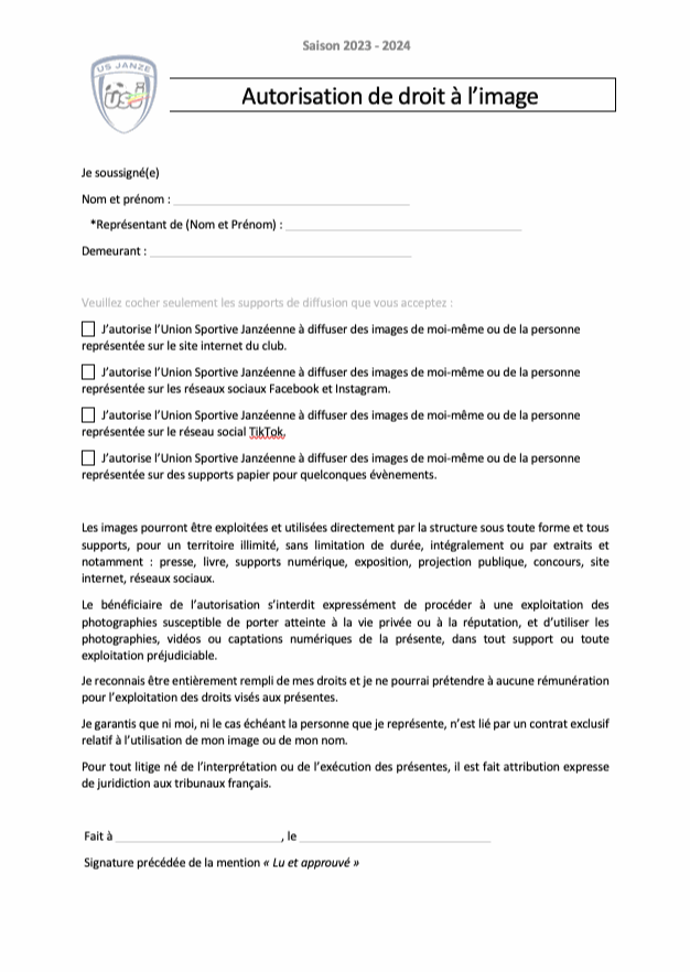 Pour préparer la nouvelle saison 2023-2024, tous les licencié(e)s de l'Union Sportive Janzéenne doivent remplir le formulaire du droit à l'image.